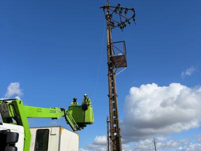 Zodra het ondergrondse netwerk operationeel was, hebben we de oude bovengrondse lijnen gedemonteerd. Dit soort werkzaamheden op hoogte vereist een strikte planning en continue monitoring van de weersomstandigheden, waarbij vooral de wind een groot risico vormt. De operaties werden uitgevoerd met hoogwerkers van minstens 20 meter hoog. Het verwijderen van de kabels gebeurde volledig veilig, met een uitgebreide signalisatie om weggebruikers te beschermen en verkeershinder te beperken.